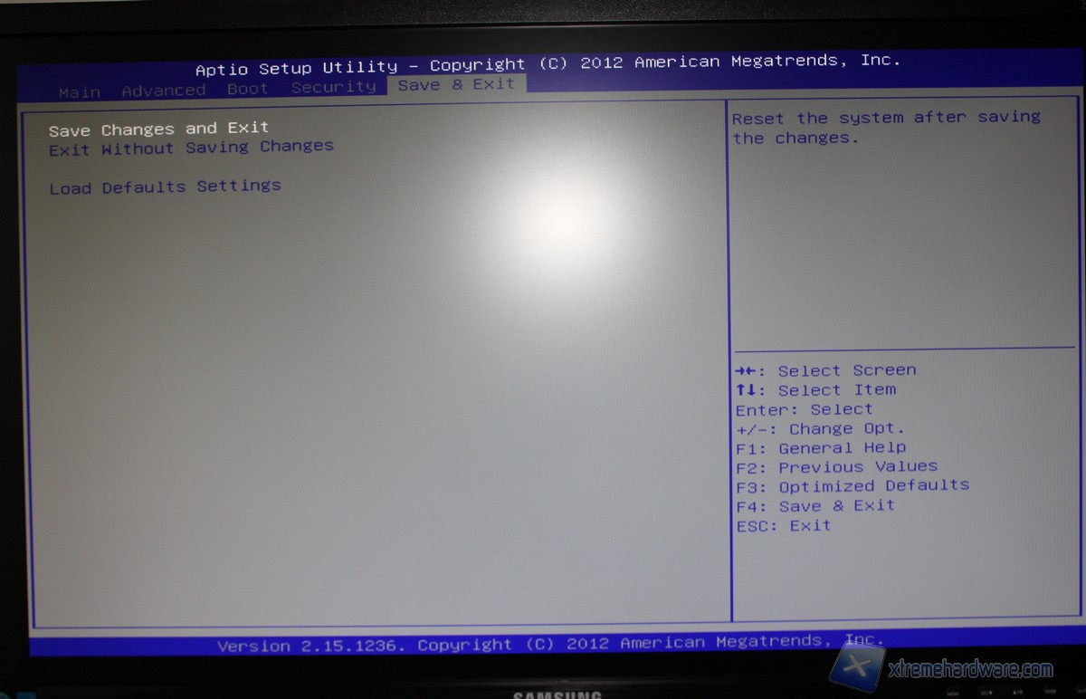 Infine l’ultimo menù chiamato Save & Exit ci permetterà di salvare tutte le impostazioni o meno che abbiamo modificato o di ricaricare facilmente i parametri base del BIOS tramite la voce Load Default Settings.